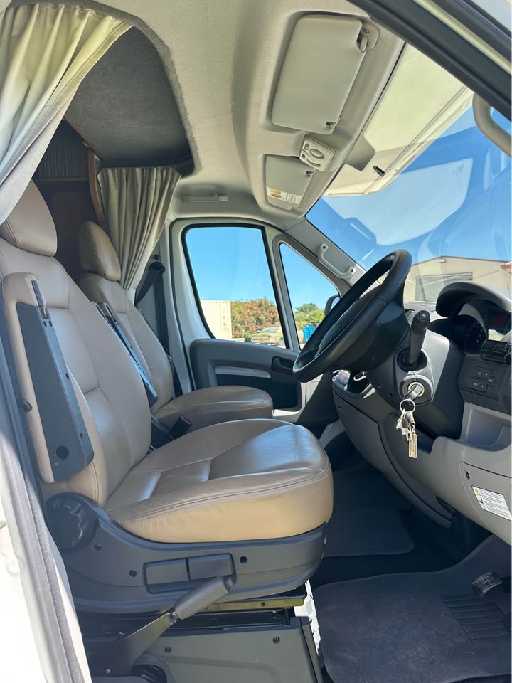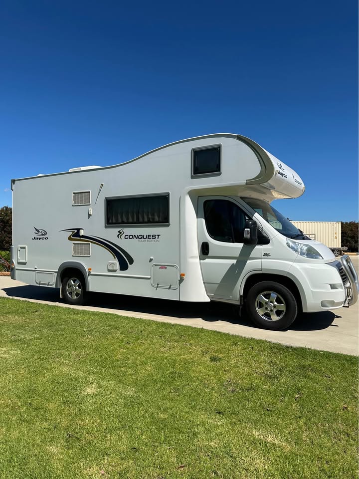 2011 Jayco Conquest FD 23-1 Touring Edition – Fiat Ducato 160 Multijet Automatic C-Class Motorhome, 4-berth, low kms (65,000km). Powered by a 3.0L turbo diesel engine with automatic transmission, 90L fuel tank, and GVM 4,005kg. Features leather seats, front swivel seats, rear view camera, reverse cycle air-conditioning, electric windows, 150W solar panel, 100Ah AGM battery, 2x 4kg gas bottles, 100L fresh water tank, grey water tank, mains pressure connection, 15A 240V inlet, wind-out awning, external power outlets and lights, drop-down picnic table, and electric entry step. Internal layout includes double bed, over-cab double bed with ladder and storage net, under-bed and overhead storage, hanging robe with drawers, café style dinette, and 12V lights to bed – perfect for touring and family adventures.